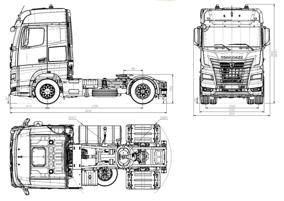 дв. КАМАЗ Р6 910.52-460 (Евро-5), система нейтрализ. ОГ, зад. мост HDZ, пер. ось КАМАЗ, МКБ, ECAS, EBS, ABS, ESP, ASR, кабина высокая, широкая 2500мм, с ровным полом, пружинная подвеска каб., проблесковые маячки, кондиционер, холодильник, автономный отопитель кабины, ПЖД, тахограф российского стандарта с блоком СКЗИ, ИТИС, мультимедиа БИС, УВЭОС, ДОПОГ, ДЗК