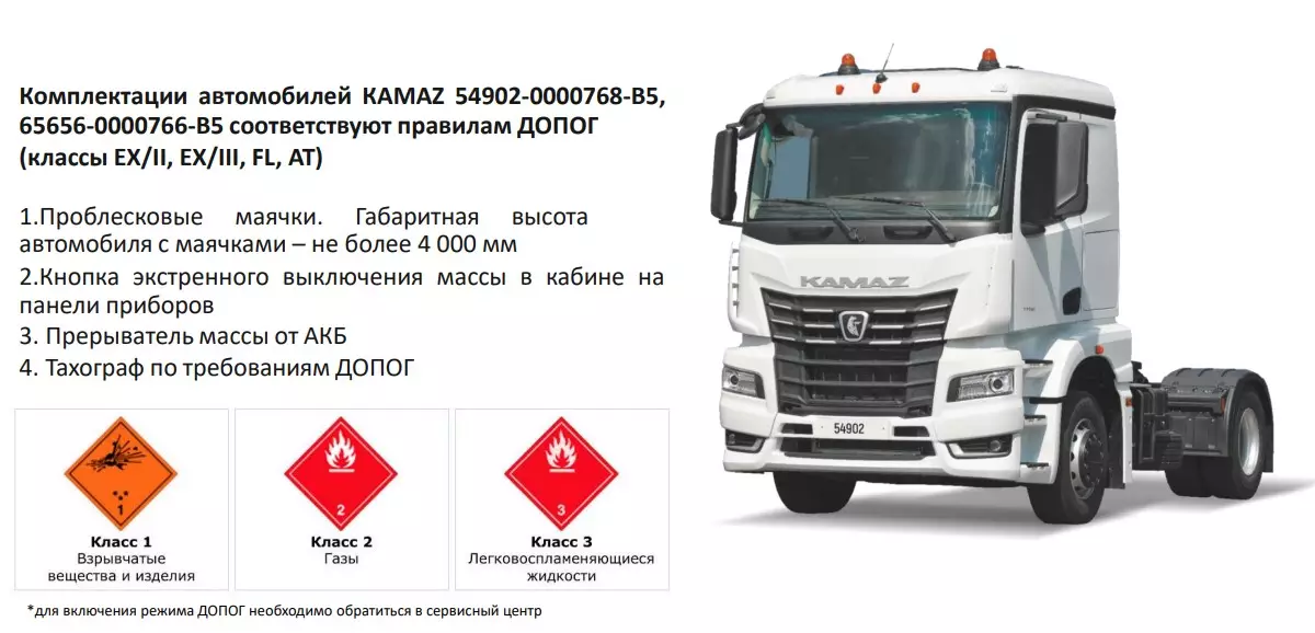 БИС КАМАЗ, электронный стояночный тормоз, регулируемая рулевая колонка, круиз-контроль, размещение АКБ слева на раме в базе, задние крылья пластиковые со съемной верхней секцией, переднее противоподкатное защитное устройство, грязевой настил, поручень для подъема на грязевой настил