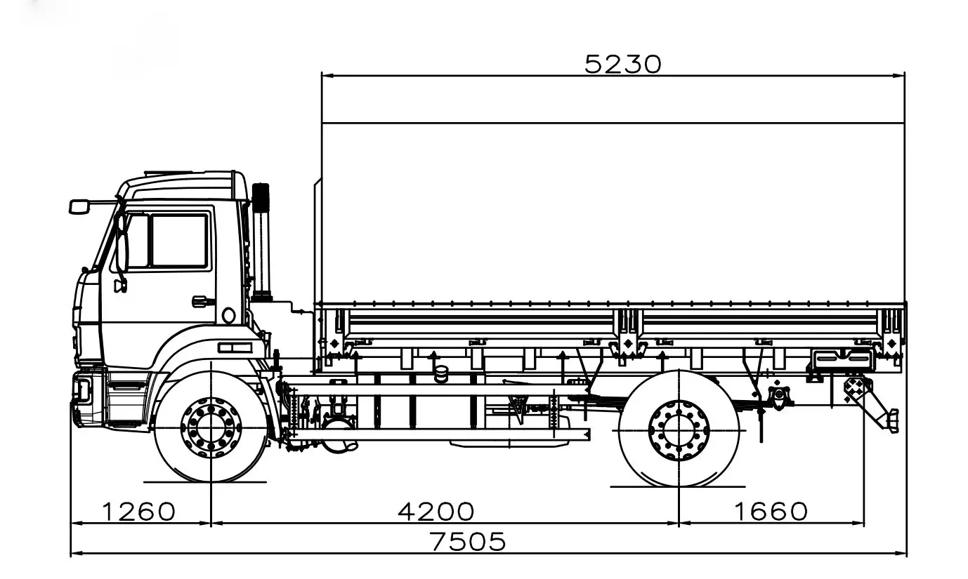 МКБ, дв. КАМАЗ 667.513-250 (Е-5), система нейтрализ. ОГ, внутр. размеры платформы 5162х2470х730 мм, аэродинамич.козырек, ДЗК, боковая защита, нижний пояс рестайлинг-2, тахограф российского стандарта с блоком СКЗИ, УВЭОС