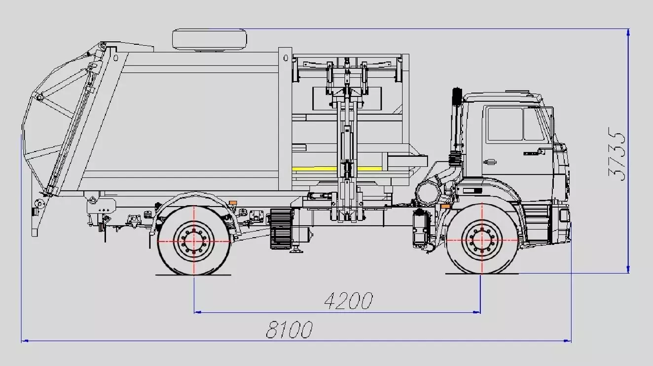Описание: Верхняя боковая загрузка, бескаркасный кузов 22м3, с механизмом подъема кузова, универсальный захват под все типы контейнеров, система автоматики,